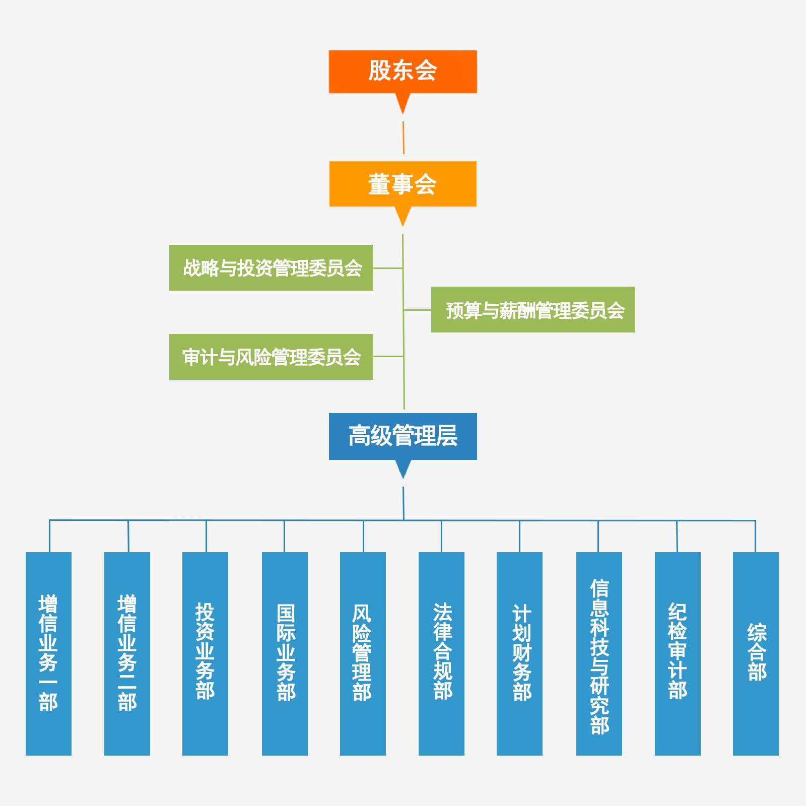 中债信用增进公司按照建立现代企业法人治理结构的要求,规范运作,成立了股东会、董事会,董事会下设战略与投资管理委员会、预算与薪酬管理委员会、审计与风险管理委员会等专业委员会,为决策提供支持。经营管理层实行总经理负责制,并构建了符合内部控制管理要求的前、中、后台组织管理架构。